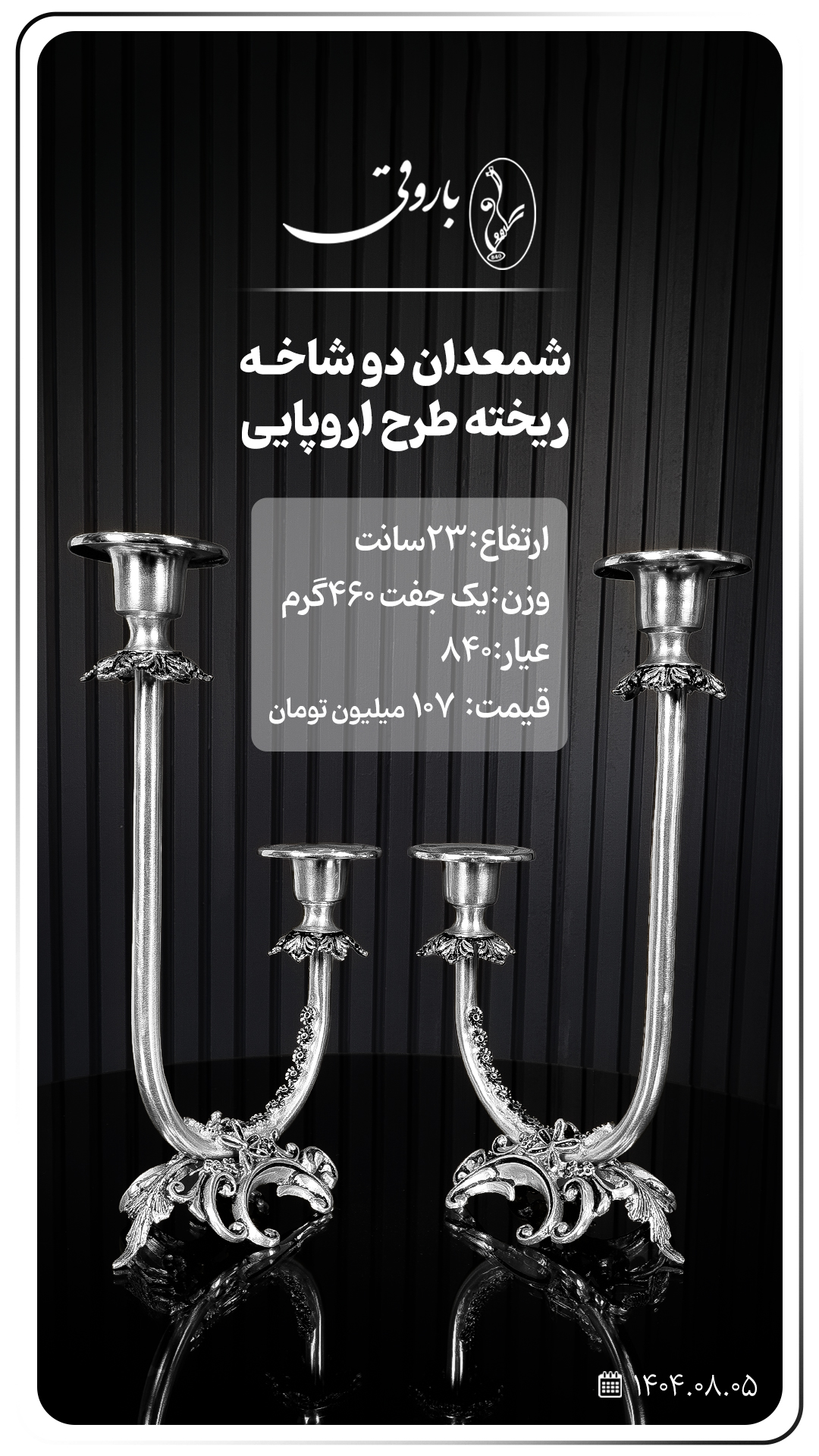 ذخیره کد محصول : ۲۰۰۰ شمعدان نقره دو شاخه ریخته طرح اروپایی قیمت تمام شده: ۱,۵۲۷,۲۰۰,۰۰۰ریال ثبت سفارش جزئیات محصول